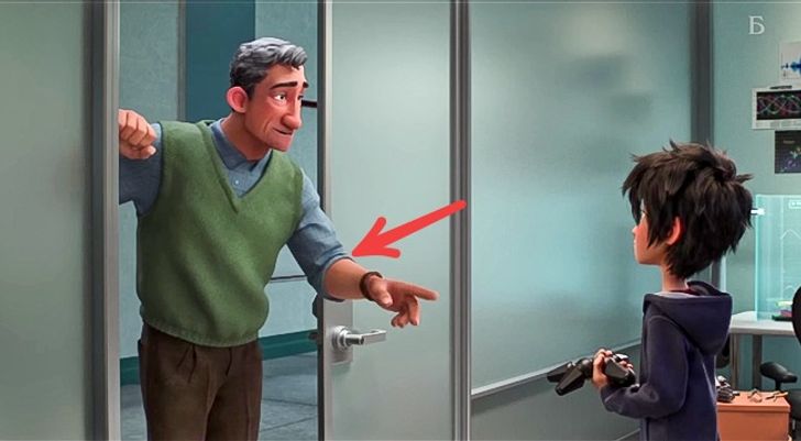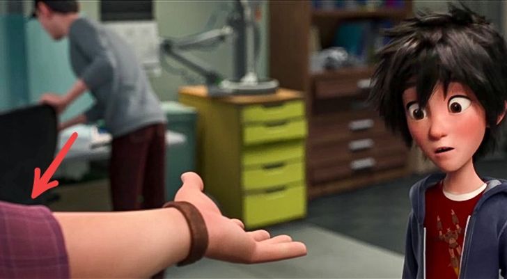 Kiedy Hiro Hamada spotyka profesora Roberta Callaghana, tego ostatniego można zobaczyć w tej samej scenie w różnych kolorach koszulek.