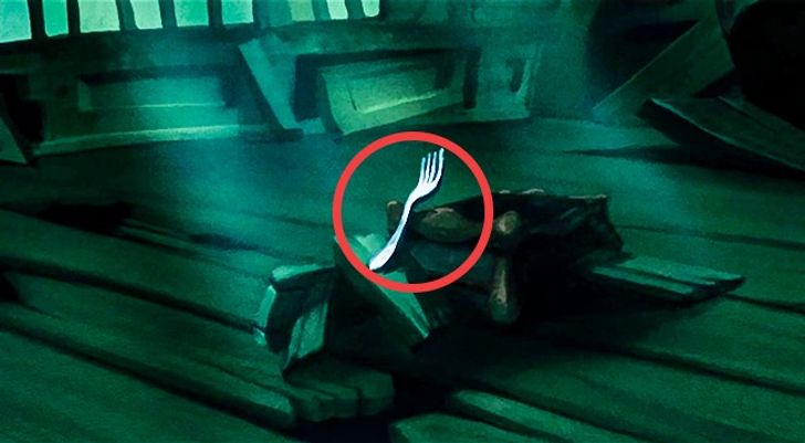 Ariel odkrywa lśniący widelec z czterema zębami. Kiedy podpływa, by po niego sięgnąć, wygląda na to, że przedmiot ma jednak tylko trzy zęby.