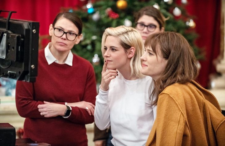 Reżyserka Clea DuVall oraz aktorki Kristen Stewart i Mackenzie Davis na planie filmu „Świąteczny szok”.