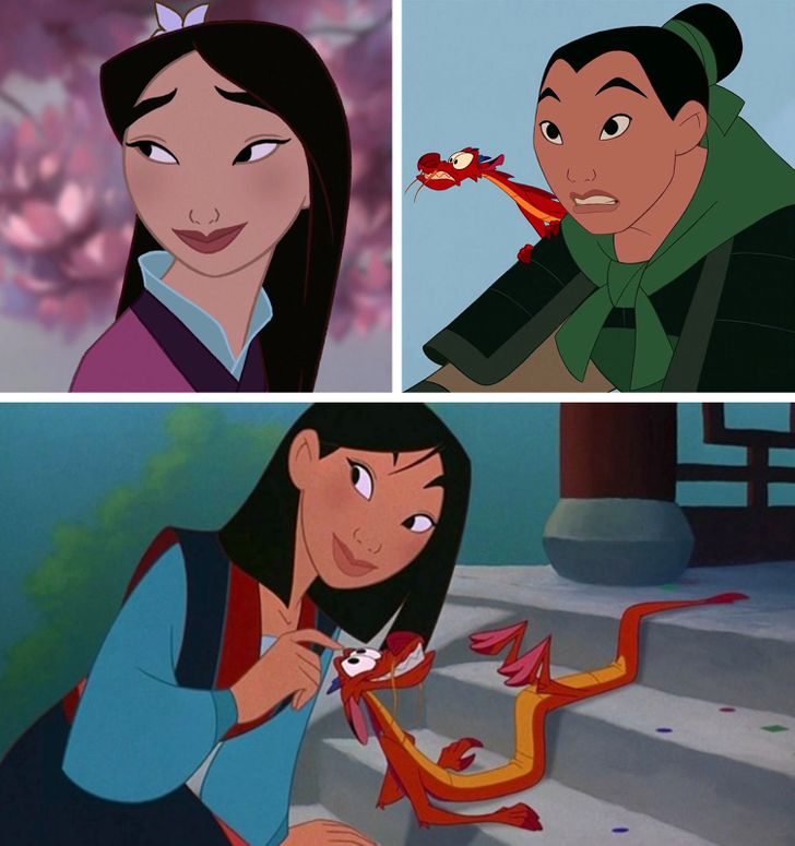 Na początku filmu Mulan ma długie rzęsy (technika często stosowana przez rysowników, aby pokazać kobiecość postaci). Kiedy natomiast udaje mężczyznę, jej długie rzęsy znikają, ale kiedy już zostaje zdemaskowana jako kobieta, nagle wracają do swojej pierwotnej postaci.