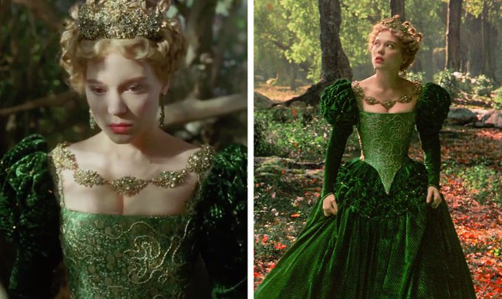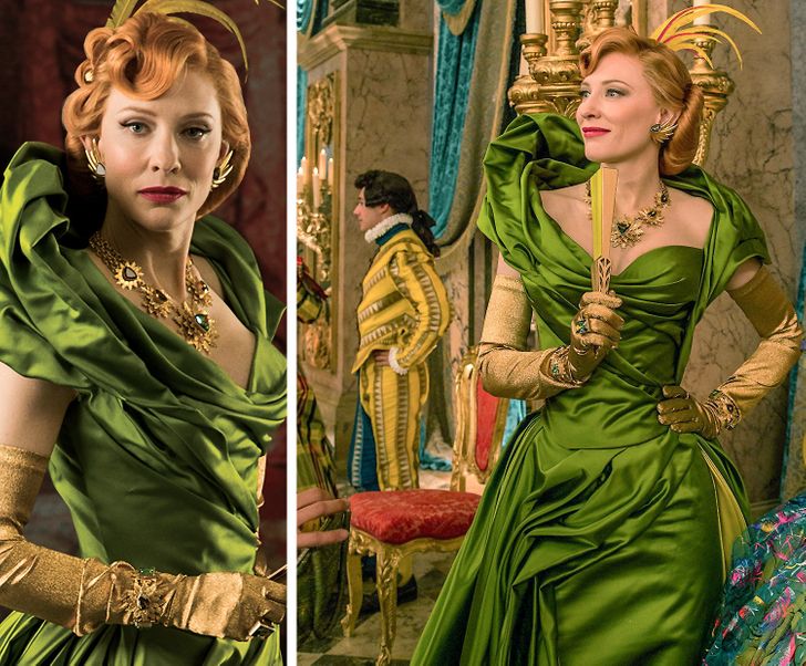 Projektantka kostiumów Sandy Powell, projektując stroje złej macochy, inspirowała się modą lat 40., dzięki czemu Cate Blanchett wcielająca się w rolę czarnego charakteru baśni wygląda stylowo i rozpoznawalnie. Za przykład może posłużyć zielona suknia, którą ubiera ona na bal, mający odmienić życie głównej bohaterki.