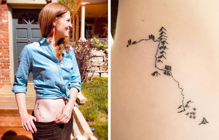 „Przez większość życia miałam obsesję na punkcie „Władcy Pierścieni”. Tatuaż przedstawia fragment szlaku, który Frodo i Aragorn przemierzają razem. Mój chłopak i ja bardzo się kochaliśmy – wspierał mnie i dawał mi więcej, niż myślałam, że drugi człowiek jest w stanie dać. Tak jak w przypadku Frodo i Aragorna, w końcu jednak nadszedł czas, aby nasze drogi się rozeszły – nie dlatego, że przestaliśmy się kochać, ale dlatego, że oboje mieliśmy inne ścieżki do przebycia. Jestem szczęśliwa, że mogłam doświadczyć tak głębokiej miłości, nawet jeśli oznaczało to bolesny koniec. A teraz… przejdźmy do następnego rozdziału.”