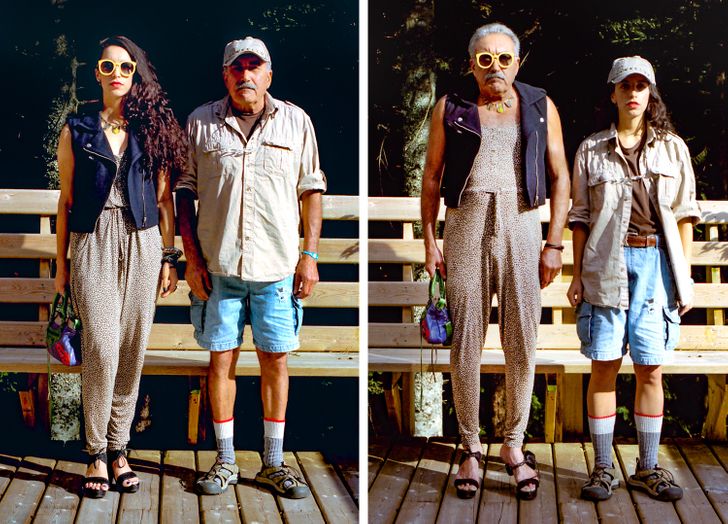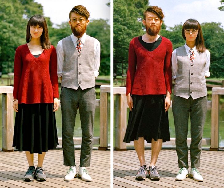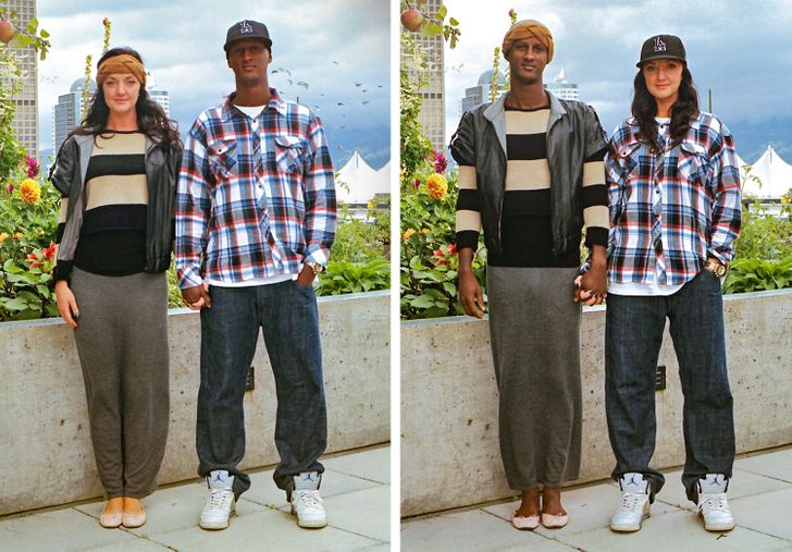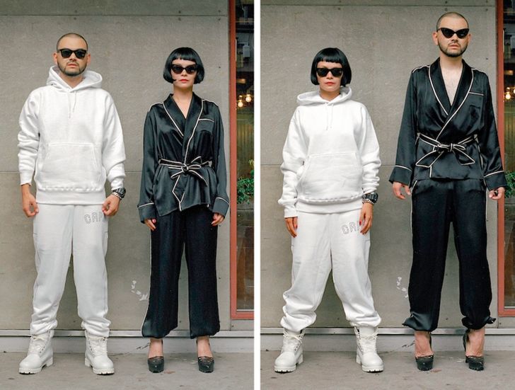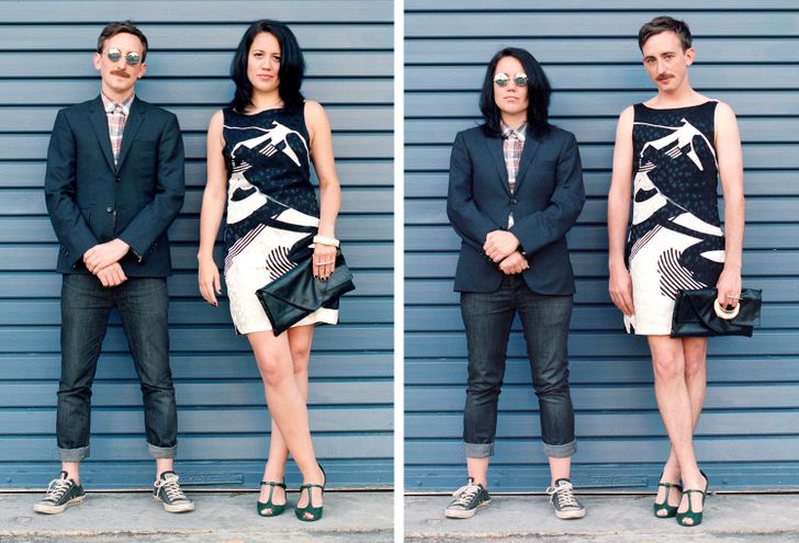 Umiejętność wchodzenia w czyjeś buty (w sensie przenośnym) jest niezwykle ważna, jednak pewna utalentowana fotografka nie poprzestaje tylko na obuwiu. Hana Pesut wpadła na pomysł ciekawej sesji zdjęciowej podczas biwaku, kiedy to zobaczyła dwóch swoich przyjaciół w bardzo różnych strojach. Jeden z nich miał na sobie wyraziste połączenie lamparcich cętek i jedwabnej apaszki, zaś drugi włożył monochromatyczny czarny T-shirt i dżinsy. Pomyślała: “Co by było, gdyby te ubrania zmieniły swoich właścicieli?” Ta seria zdjęć jest czymś więcej niż tylko zestawieniem ciekawych obrazków – zmusza nas bowiem do zastanowienia się nad normami płci i wywołuje dyskusje na temat ich prezentacji w dzisiejszym społeczeństwie.