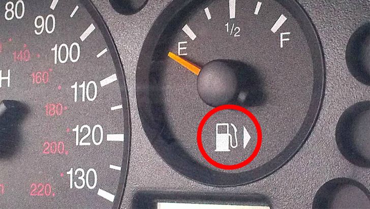 Mała strzałka obok oznaczenia zbiornika na wskaźniku poziomu paliwa wskazuje, po której stronie samochodu znajduje się ten zbiornik.