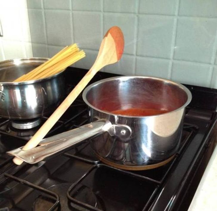 Większość z Was zapewne wiesza garnki i patelnie na małych otworach umieszczonych w ich uchwytach. Okazuje się jednak, że można je również wykorzystać do przytrzymywania łyżek podczas gotowania, aby uniknąć ich zabrudzenia.
