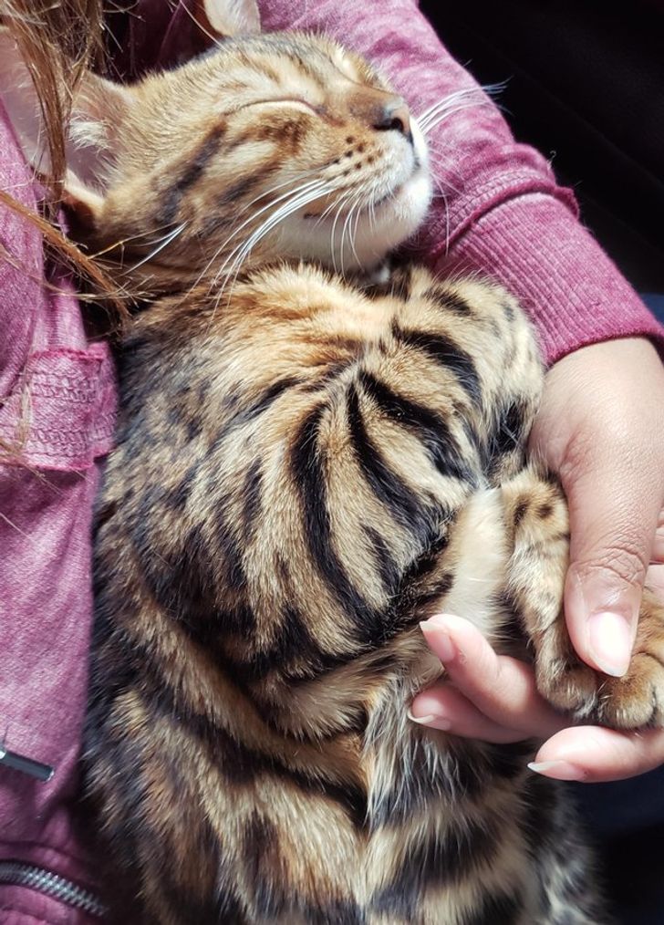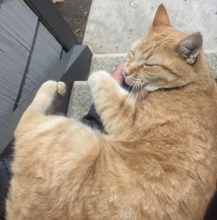 „To nie jest mój kot, ale kiedy wracam z pracy do domu i przypadkiem słyszy zamek mojego samochodu, zawsze podbiega do mnie i podąża za mną do drzwi, miaucząc, dopóki nie usiądę i nie pozwolę mu zdrzemnąć się na moich kolanach.”
