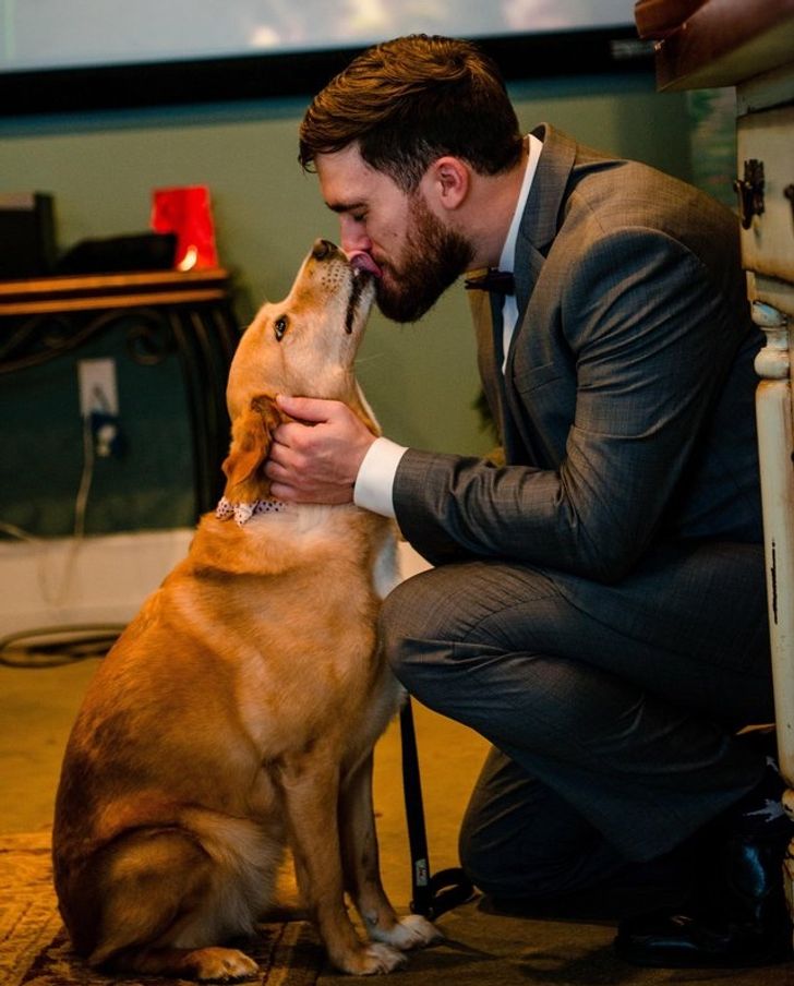 „To mój narzeczony w dniu naszego ślubu z moim psem, którego miałam, zanim zaczęliśmy się spotykać.”