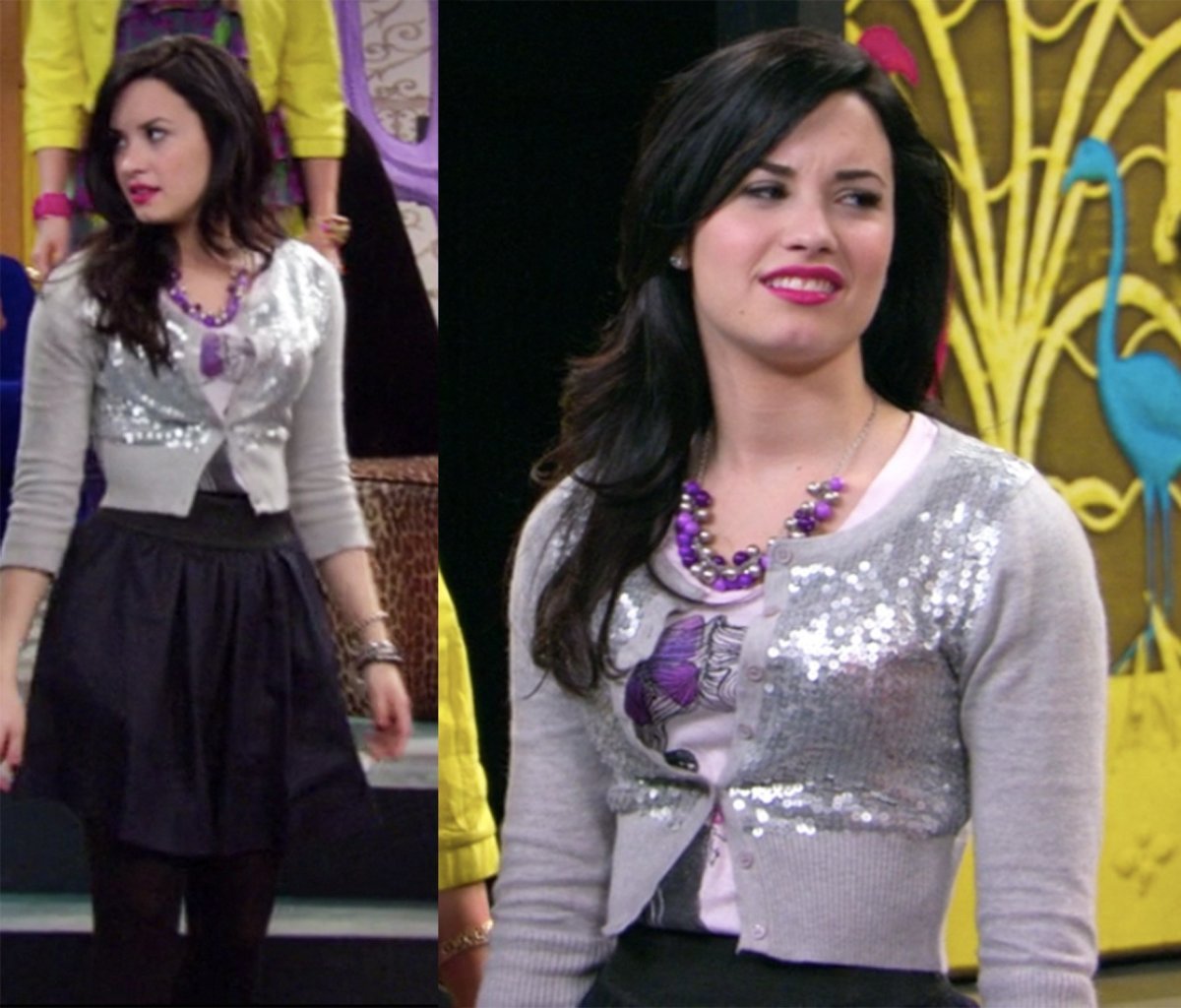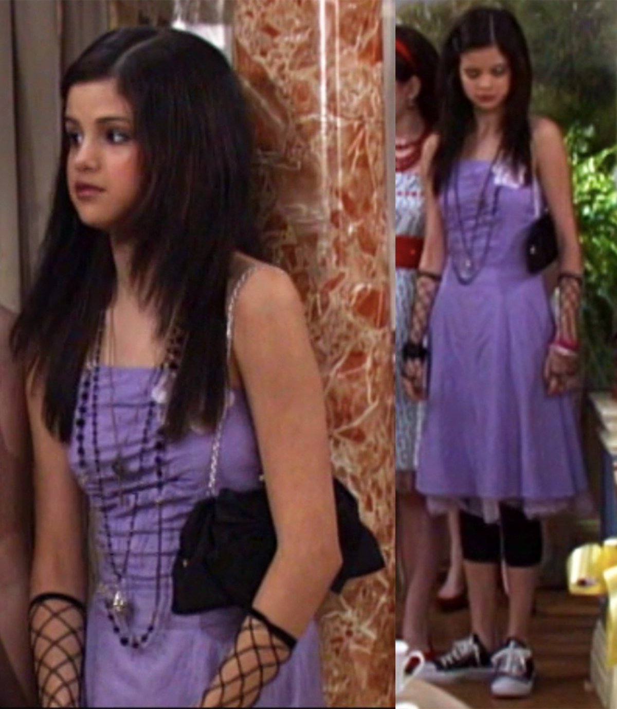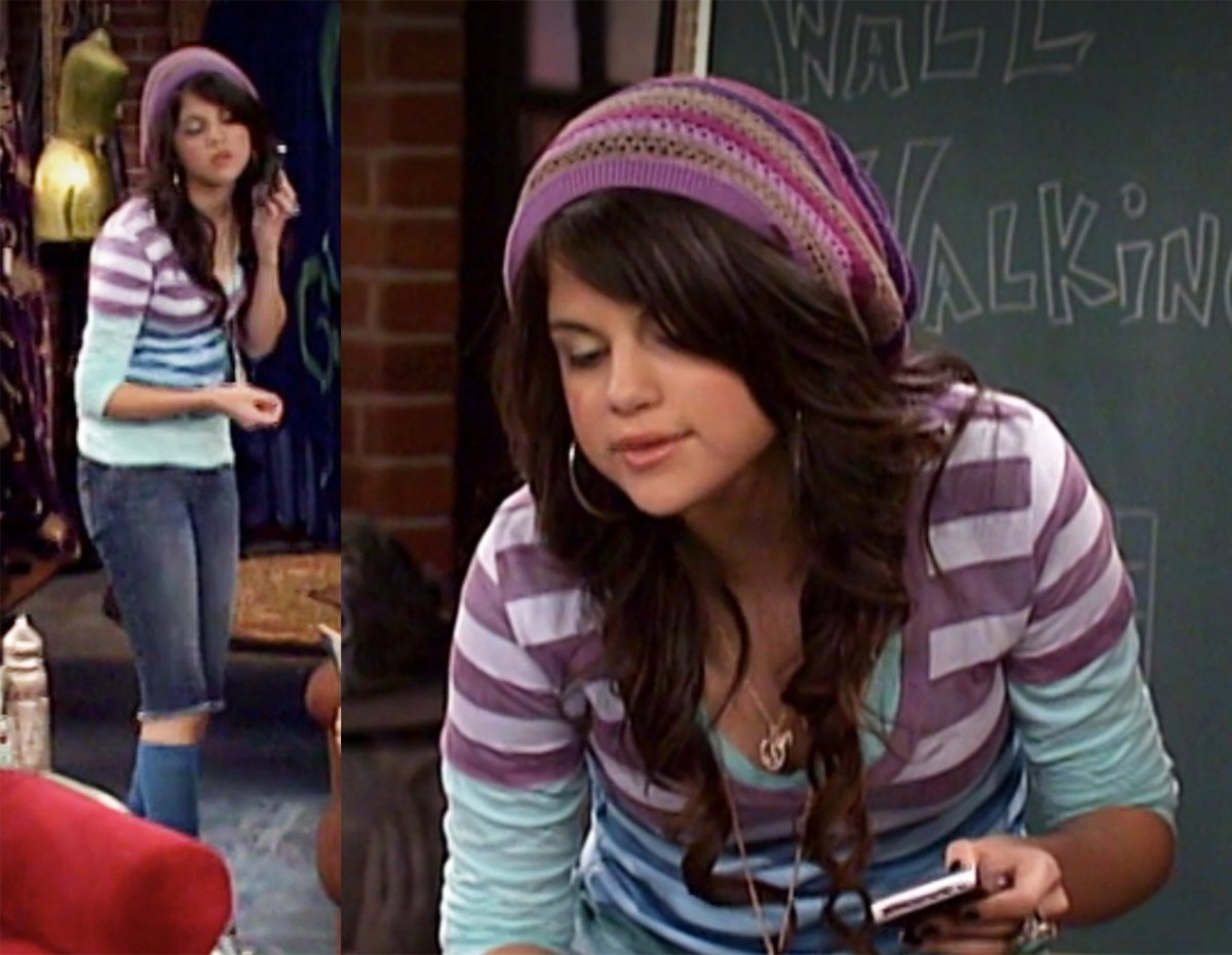 Najprawdopodobniej styliści zobaczyli dwa ubrania w fioletowe paski i uznali, że to wystarczy. Ciekawostka: podobna czapka pojawiła się w kolekcji Seleny „Dream Out Loud” w pewnej sieci dyskontów.