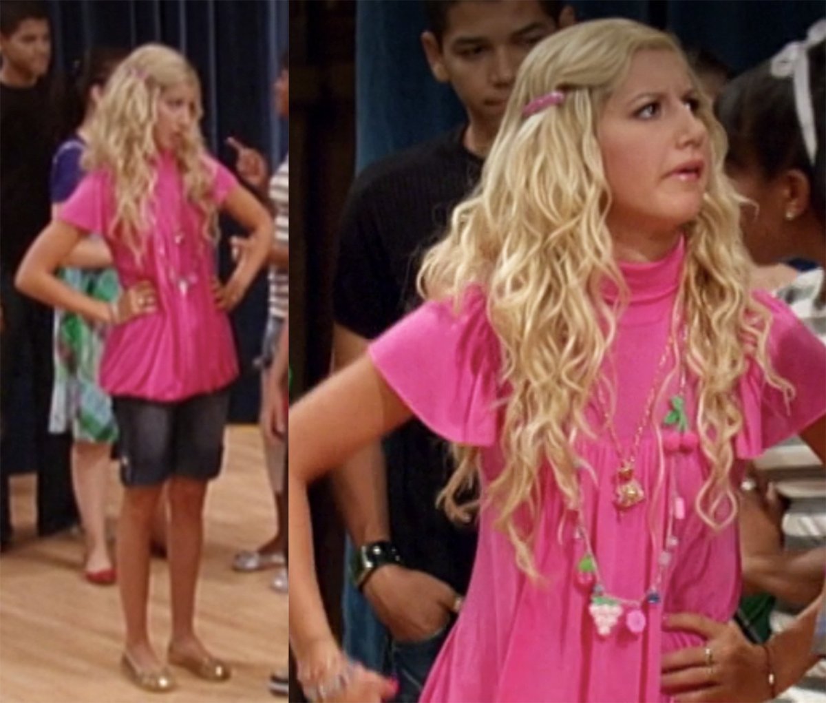 Ta stylizacja przeżywa większy kryzys tożsamości niż Maddie, gdy nie została obsadzona w roli Sharpay. Czy to jest tunika? Fantazyjna bluzka? A może golf? Nie możemy też nadziwić się owocowym zawieszkom na jej naszyjniku – ciekawe, od którego dziecka je pożyczyła…