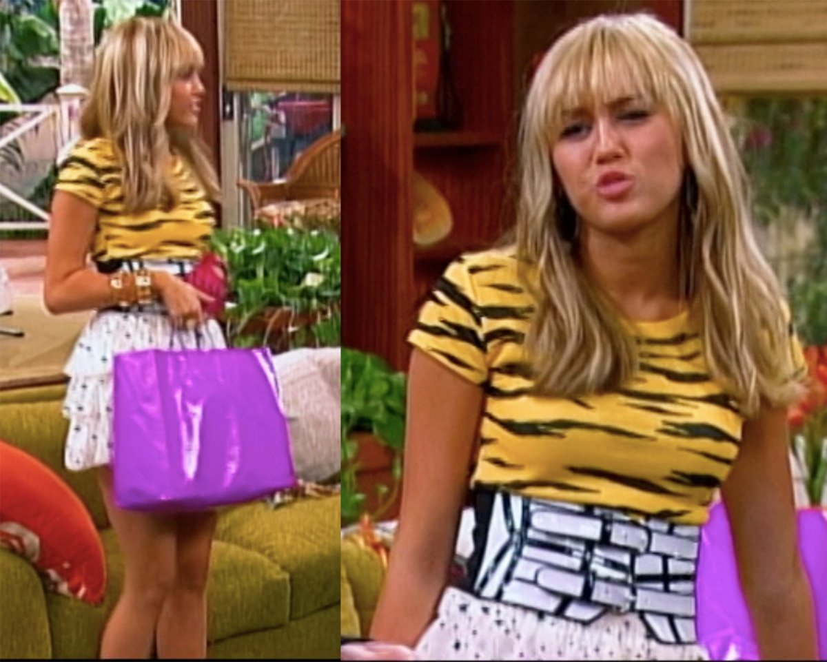 To początek okresu, który można nazwać „fazą klauna”, kiedy Miley ubierała się normalnie, a Hannah robiła wszystkie swoje ubrania z namiotów cyrkowych. Taką samą koszulkę miała też w kolorze różowym, a tego ogromnego paska nawet nie będziemy komentować…