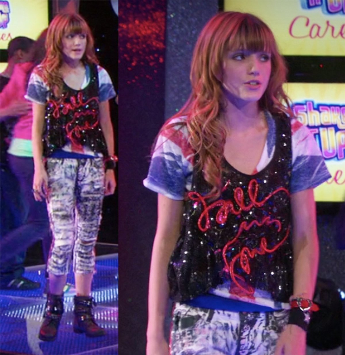 Jedynym logicznym powodem, dla którego Bridgit Mendler ubrała się w ten strój, wydaje nam się fakt, że ciągle gubiła się na planie i potrzebowali łatwego sposobu, aby ją zauważyć. Neonowa kombinacja kolorów przyprawia nas o ból głowy.