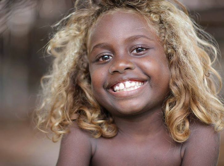 Grupa rdzennych mieszkańców Melanezji, zamieszkująca Wyspy Salomona, na północny wschód od Australii, słynie z pięknej ciemnej skóry i naturalnych blond włosów.