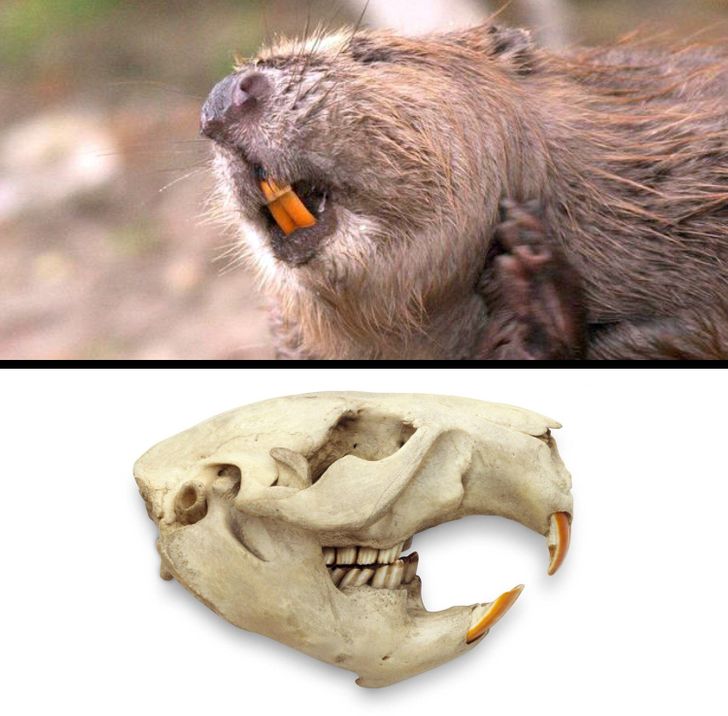 Siekacze bobrów są pomarańczowe, ponieważ zawierają żelazo, które sprawia, że ich zęby są mocniejsze i lepiej radzą sobie z przecinaniem drewna.