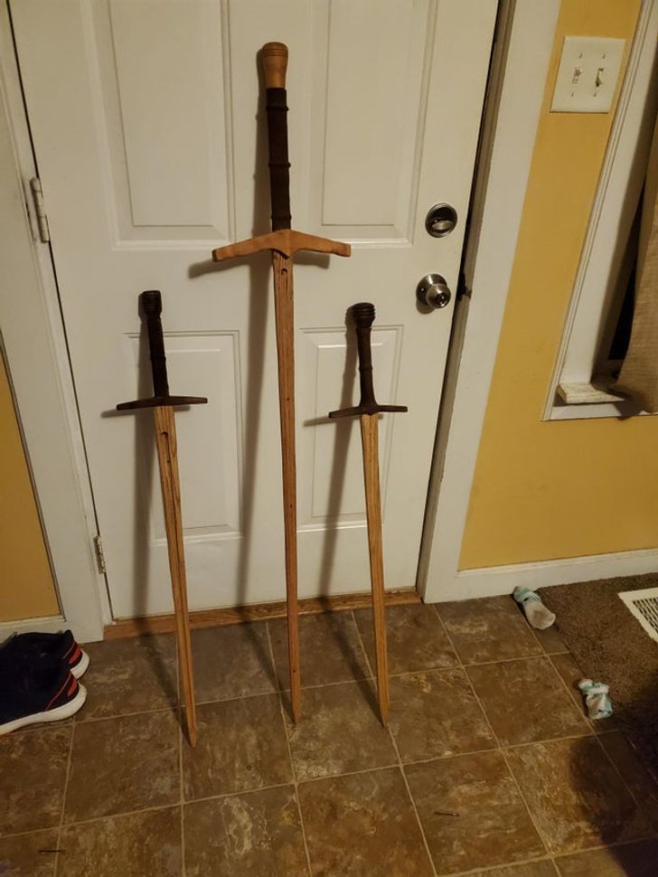 „Córeczka mojej dziewczyny poprosiła mnie o drewniany miecz… i trochę mnie poniosło. Jest dębowy, z okuciami z wiśni i orzecha, a jego rękojeści są owinięte skórą.”
