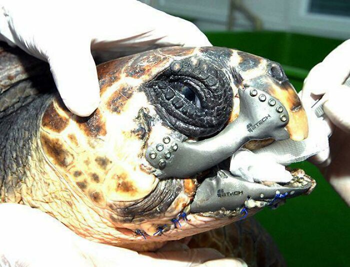 31. Żółw Loggerhead uległ wypadkowi na łodzi, w wyniku którego stracił większość dolnej części dzioba. Naukowcy dali mu nowy, wydrukowany w 3D tytanowy dziób.