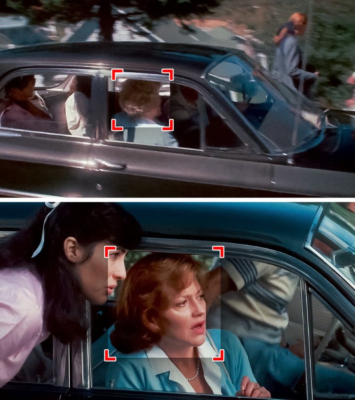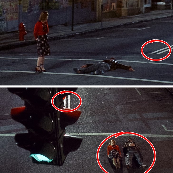 Pamiętacie legendarną scenę, w której główni bohaterowie leżą na ulicy? Zwróćcie uwagę na podwójną linię ciągłą w tych dwóch ujęciach. Ewidentnie coś tu poszło nie tak…