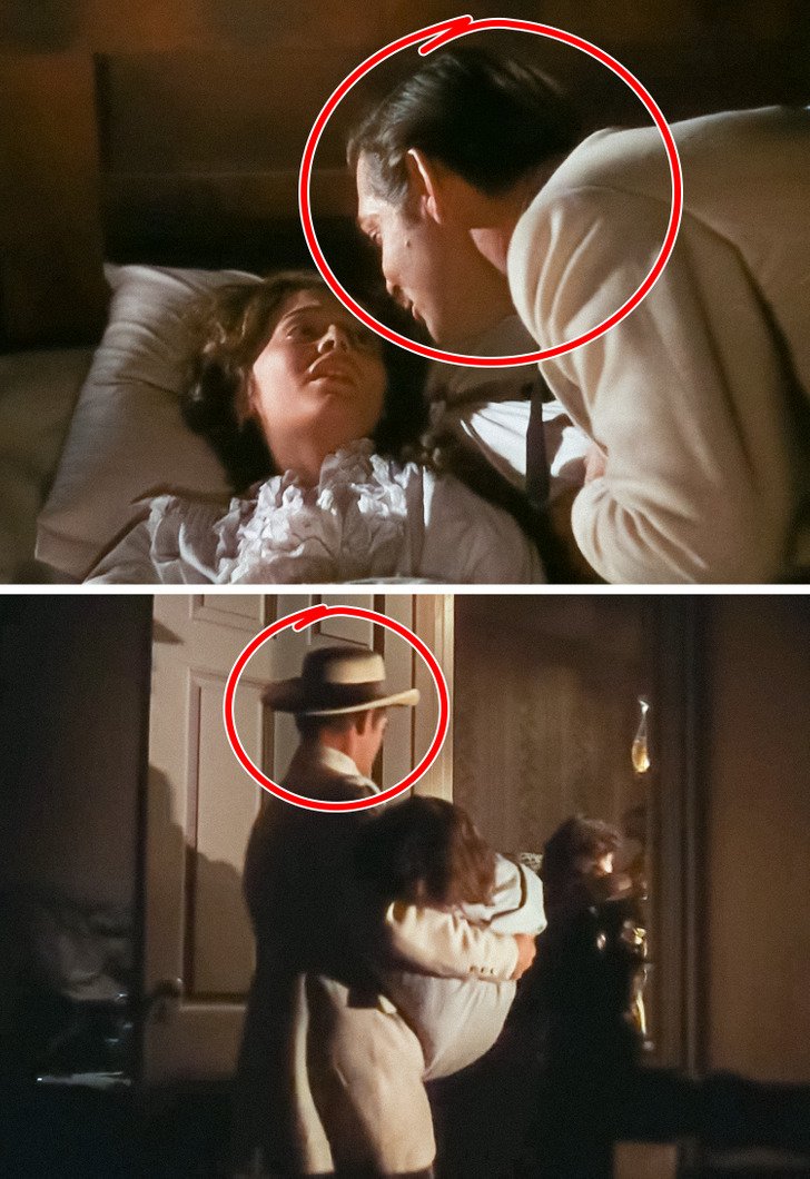 Tutaj problematyczny okazał się kapelusz Rhetta, który magicznie pojawia się na jego głowie w momencie trzymania w ramionach Melanie. Jest to o tyle dziwne, że jeszcze sekundę wcześniej mężczyzna nie posiadał żadnego nakrycia głowy…