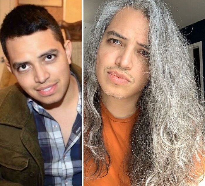 2. „W młodym wieku zmagałem się z siwizną. Wstydziłem się jej, ponieważ koledzy z klasy śmiali się ze mnie, więc zacząłem farbować włosy na czarno. 3 lata temu zdecydowałem się przestać używać farby i pozwolić włosom rosnąć. Chciałem zaakceptować swoją siwiznę i zachęcić innych do tego samego. W każdym wieku można mieć siwe włosy!”