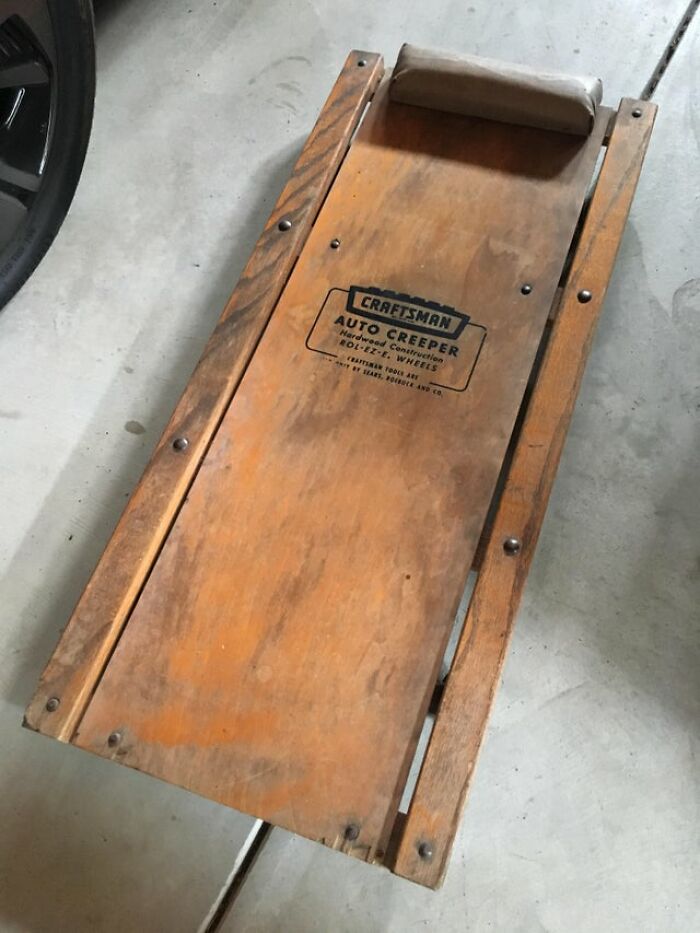 28. Leżanka warsztatowa odziedziczona po dziadku – po 80 latach nadal używana do wymiany oleju.