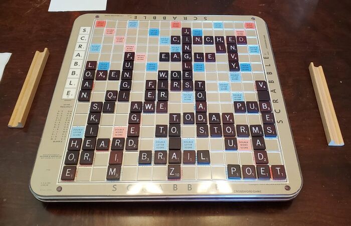 45. Plansza do Scrabble z 1976 roku z podniesionymi liniami siatki i obrotową podstawą. Nadal posiada wszystkie elementy.