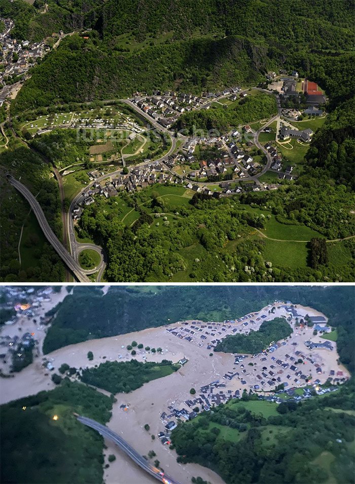49. Altenburg, Niemcy. Przed i po silnej powodzi spowodowanej nadmiernymi opadami deszczu.