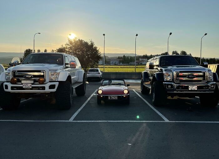 23. „Mój Triumph Spitfire z 1977 roku pomiędzy dwoma Fordami.”