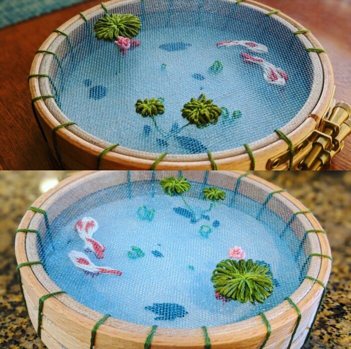 17. „Próbowałam swoich sił w haftowaniu stawu dla karpi Koi. Efekt końcowy jest super! To prezent dla mojej siostry, która kocha Koi.”