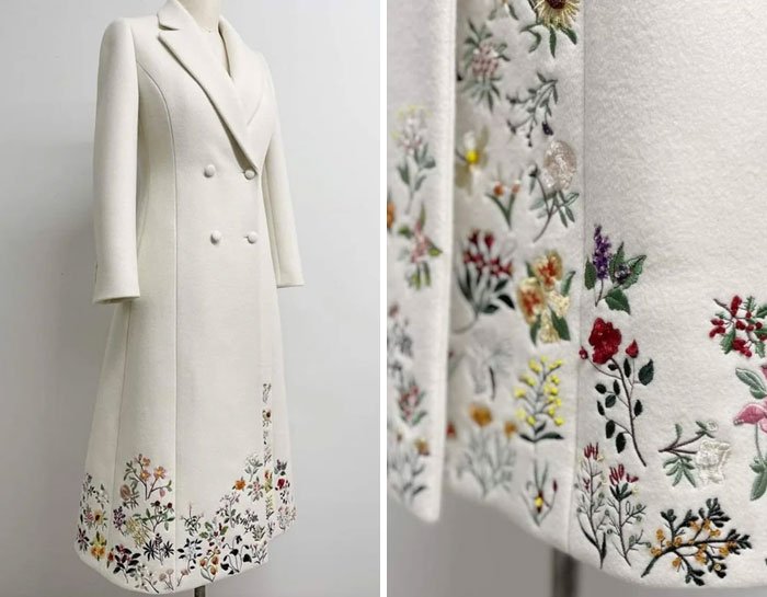 4. Płaszcz dr Jill Bidens na wieczór jej inauguracji, zawierający kwiaty z wszystkich 50 stanów. Urugwajsko-amerykańska projektantka Gabriela Hearst powiedziała, że każdy kwiat wymagał od 2 do 4 godzin ręcznej pracy.