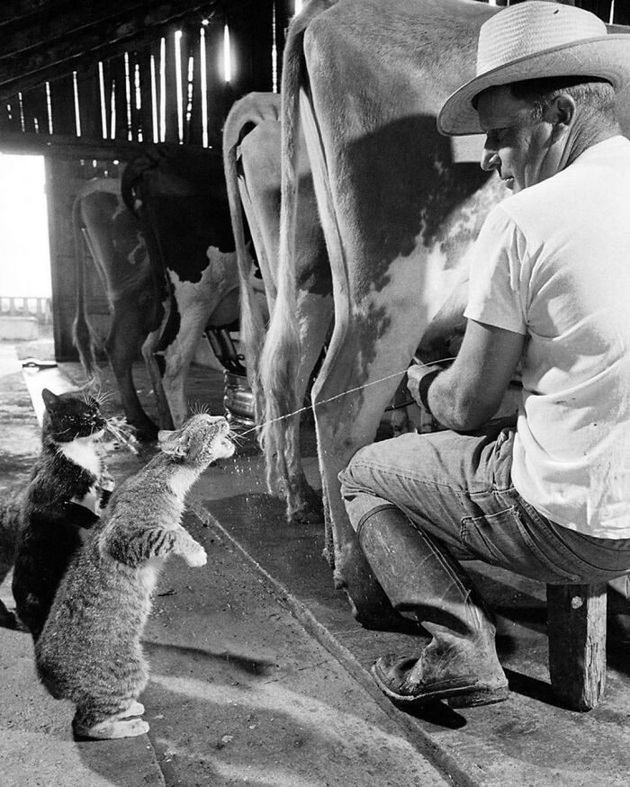 2. Koty Blackie i Brownie łapiące strużki mleka podczas dojenia na farmie mlecznej Archa Badertschera we Fresno, Kalifornia, 1954 r.