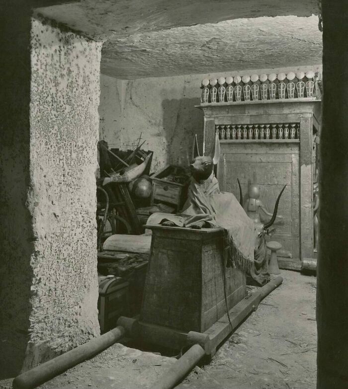 25. Posąg Anubisa w grobowcu Tutanchamona (zdjęcie zrobione w 1922 roku).