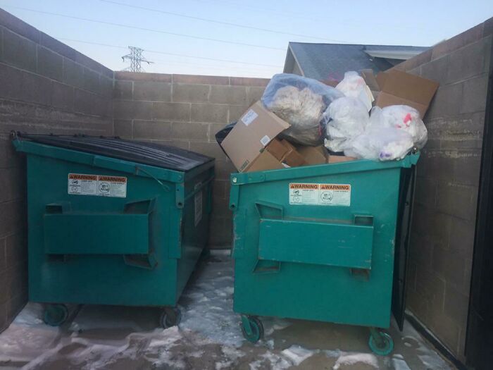 41. Śmietnik po lewej stronie jest pusty, ale ludzie są zbyt leniwi, by otworzyć pokrywę, więc po prostu układają śmieci w prawym śmietniku.