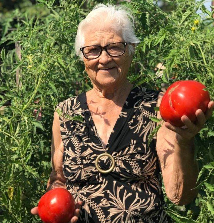 Dumna babcia i jej samodzielnie wyhodowane pomidory.