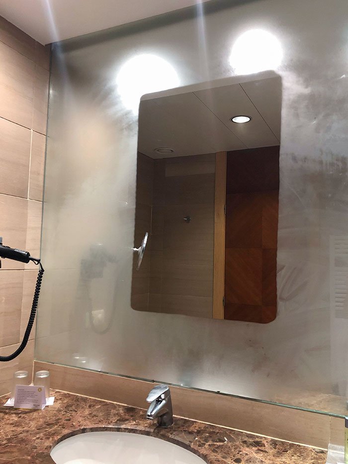 23. „W mojej łazience w pokoju hotelowym jest część lustra, która nie paruje.”