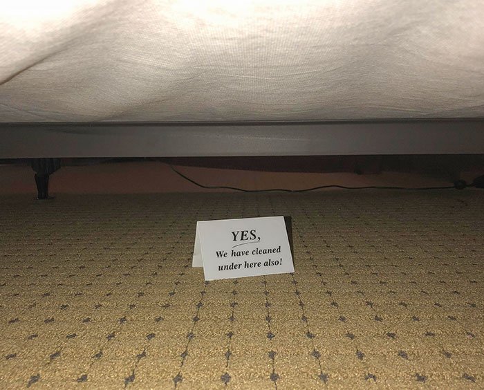 19. Notatka pod łóżkiem w pokoju hotelowym, która daje znać, że tam też posprzątali.