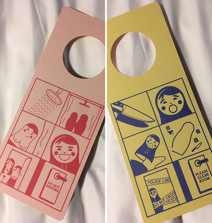20. Znaki na drzwi pokoju hotelowego: „Nie przeszkadzać” i „Proszę posprzątać pokój”.