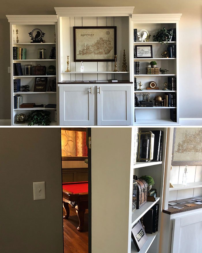 22. „Hotel, w którym się zatrzymałem, ma pokój bilardowy – prowadzą do niego sekretne drzwi ukryte za tym regałem.”