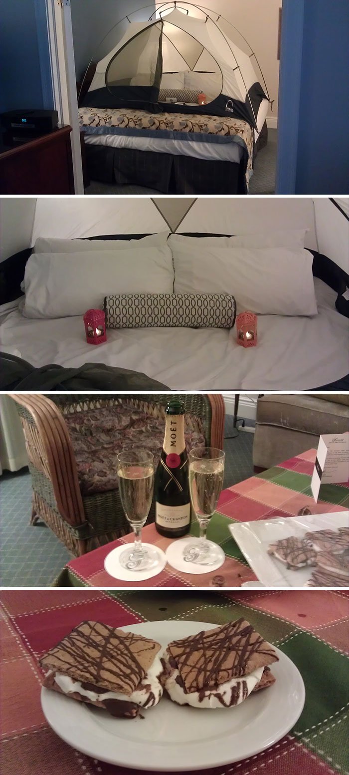 3. „W tym roku nie udało mi się wyjechać na kemping, więc poprosiłem o namiot w moim pokoju hotelowym.”