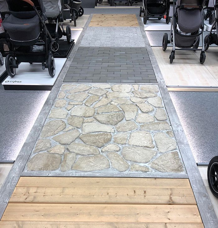 21. Ten sklep z artykułami dla dzieci ma różne powierzchnie do testowania wózków.