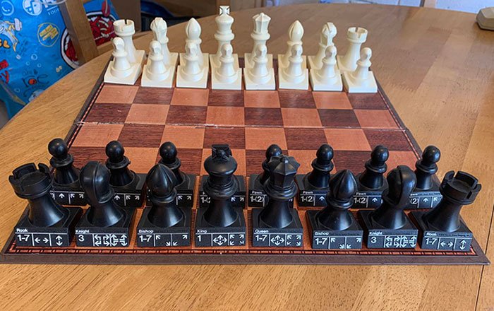 32. Ten zestaw szachowy z 1972 roku ma wytłoczone na podstawach pionków prawidłowe ruchy każdego z nich, dzięki czemu gra jest znacznie łatwiejsza dla początkujących.